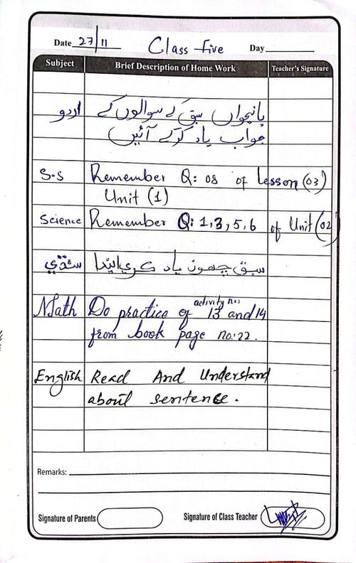 Class 5 Diary 27 November 25