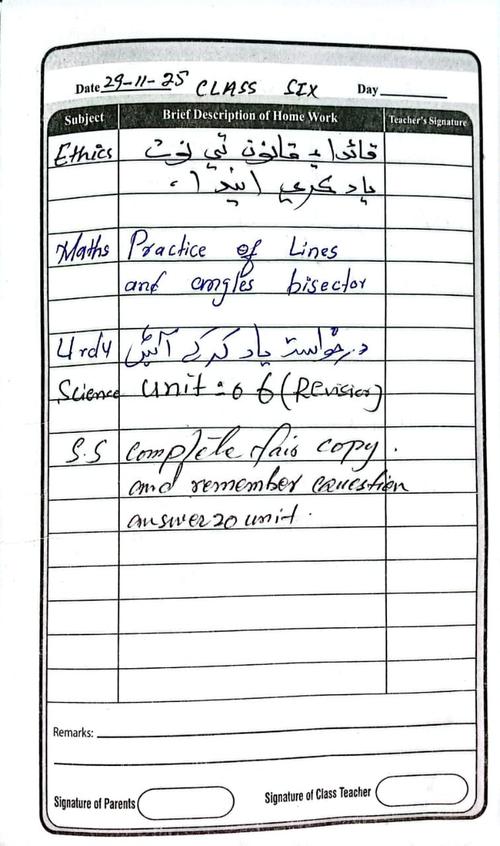 Class 6 Diary 29 November 2025