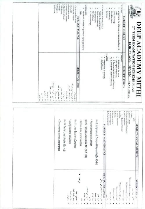 2nd Term Exams Scheme Class 7