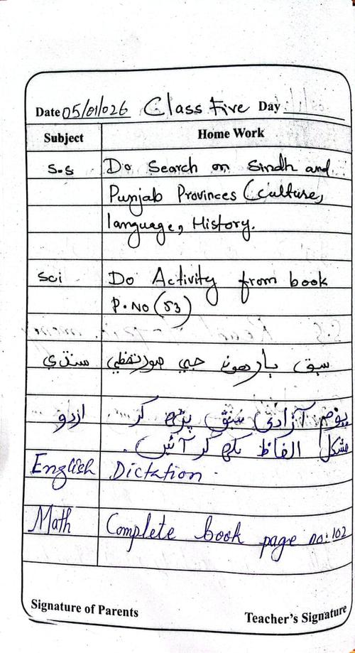 Daily Diary Class Five, 05/01/2026