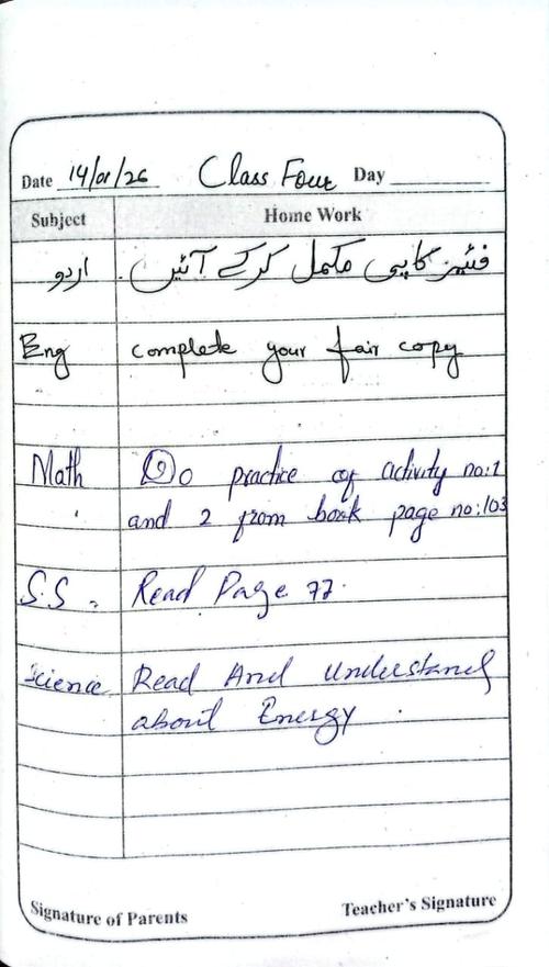 Daily Diary Class 4, 14 January 2026