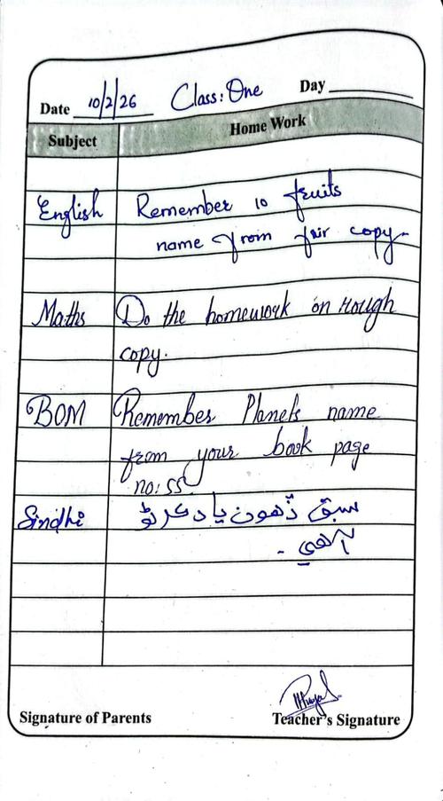 Daily Diary Class 1, 10 February 26