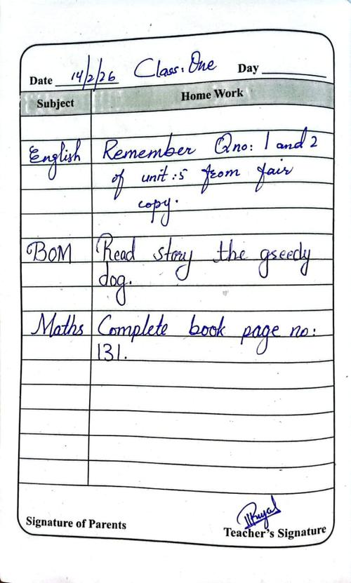 Daily Diary Class 1, 14 February 26